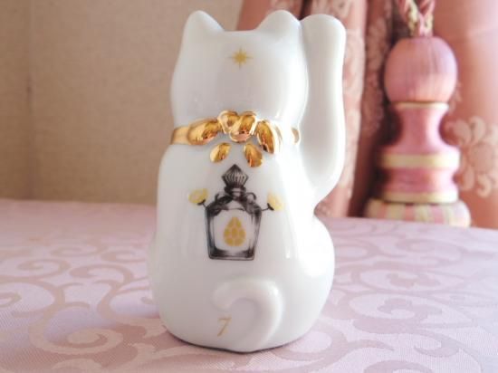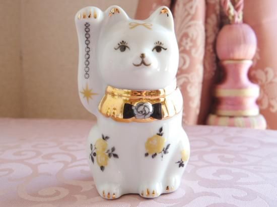 薔薇とパフュームで気品のあるマドモアゼル招き猫。右招きは「幸運・金運」を招きます。